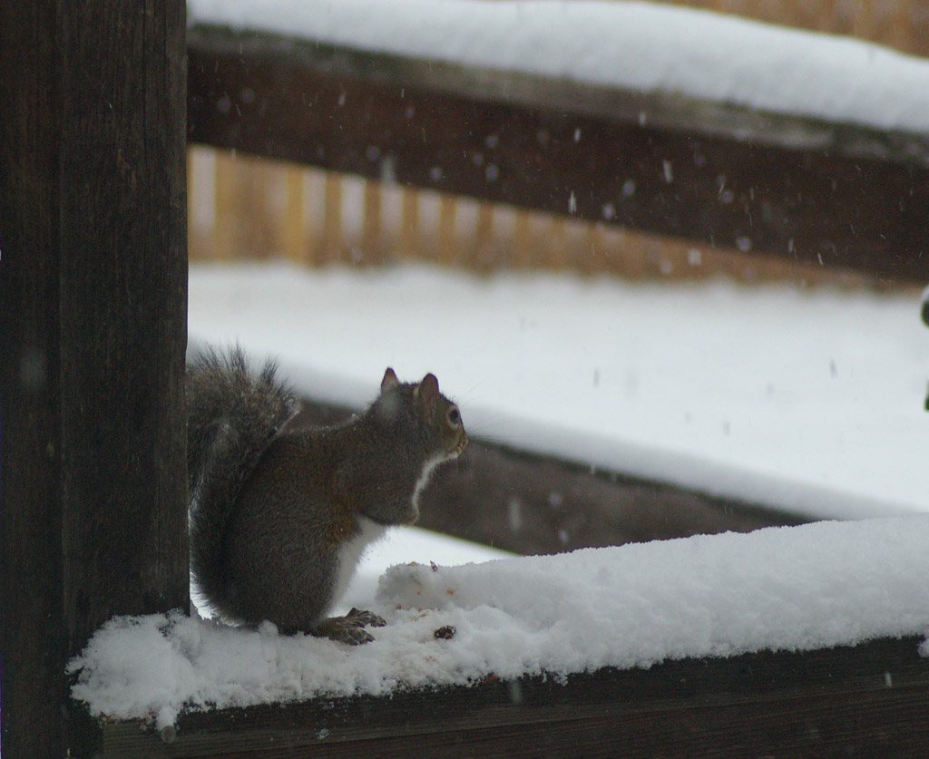 I like the way it looks, but sure hate driving in it !! Put on my Tamron 70-300MM lens, and took a few shots out of the window, caught falling flakes, and a squirrel chewing on an acorn.