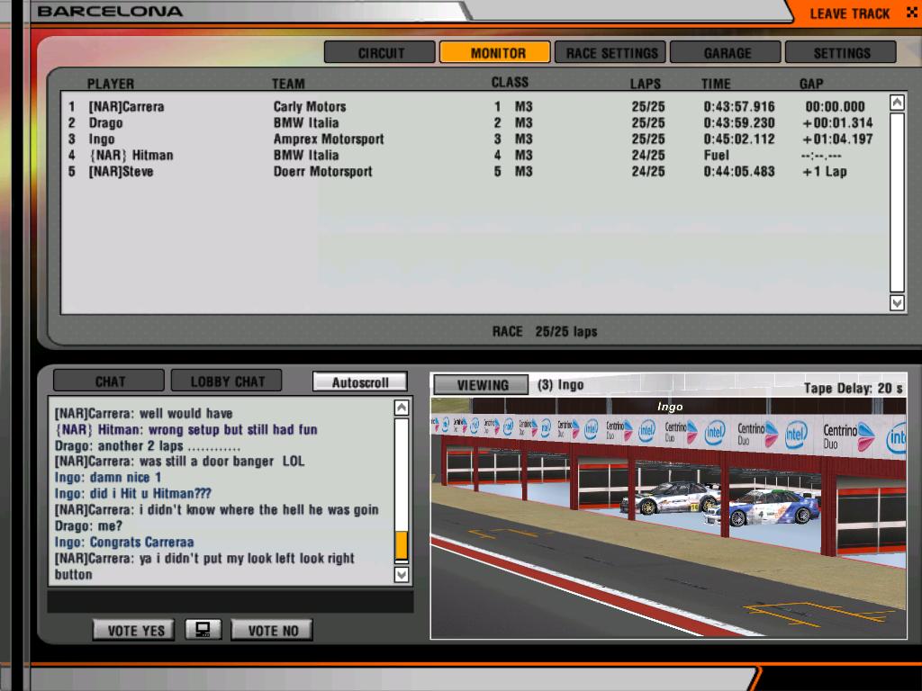 Looks great.Thanx to Drago for using hard tires and 100 litres of fule just to slow himself down....LOL>...i saw a 1:39 in practise so I was naturally worried.No biggie though as it is fun to battle for anyplace with the pros....the qualifying was ultra close.Now the big news.I had been practising the road america track thinking that was first.I am glad Boon didn't get a chance to drive.He would have practised the wrong track and been just as shocked as I when I got into the room....Barcelona??wtf??..LOL...but I had already had soem time in the meganes there so I was ok...Boon would have been screwed ROFL...I will consider myself lucky.I don't think I even had a lap left where I could keep ahead of Drago.I actually tapped him and spun him once for which I apologize.I went through the replay and sometimes it looked like we were glued together...LOL...It was major fun and second or thrird place wouldn't have mattered..it was just a blast.I will be in vancouver this weekend shopping for christmas presents so i will miss the track i put so much time on...but I hope it will end up being as fun as this one for you guys.