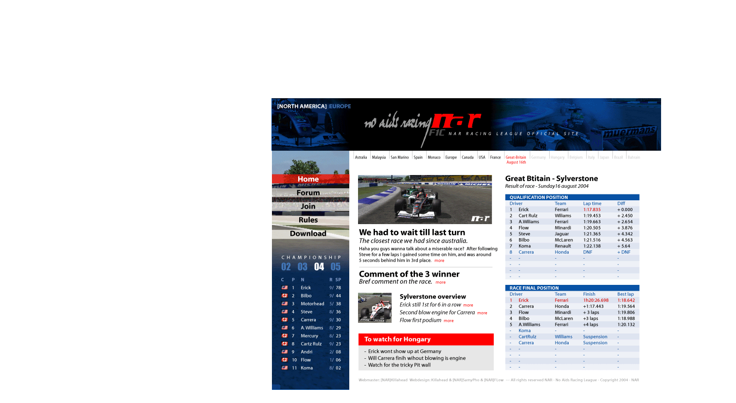 well i know i'm mathematically out of the championship but i like the "things to watch out for...will carrera blow his engine again"..rofl,,,that caption i like alot..LOL...by the way i didn't blow my engine in hungary i just lambasted flow in the off camber corner and screwed up my race at the start also...still...great looking website flow...very professional looking and clean color wise...i say...flow for president(in the U.S cuz he would at least have a good medical plan..LOL..)...please watch out for massive smoke and fire behind a certain honda powered BAR in monza..hehehe...